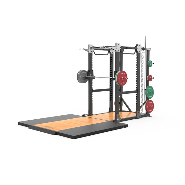 功能区:杠铃片整组挂架、举重杆保护架、单杠架、可调引体向上架、粗绳训练器、弹力带挂架